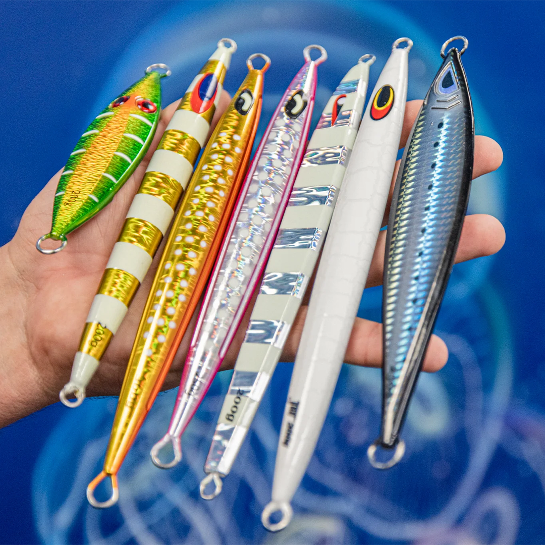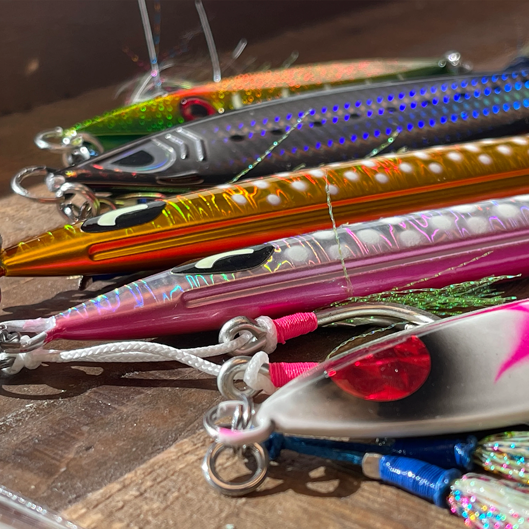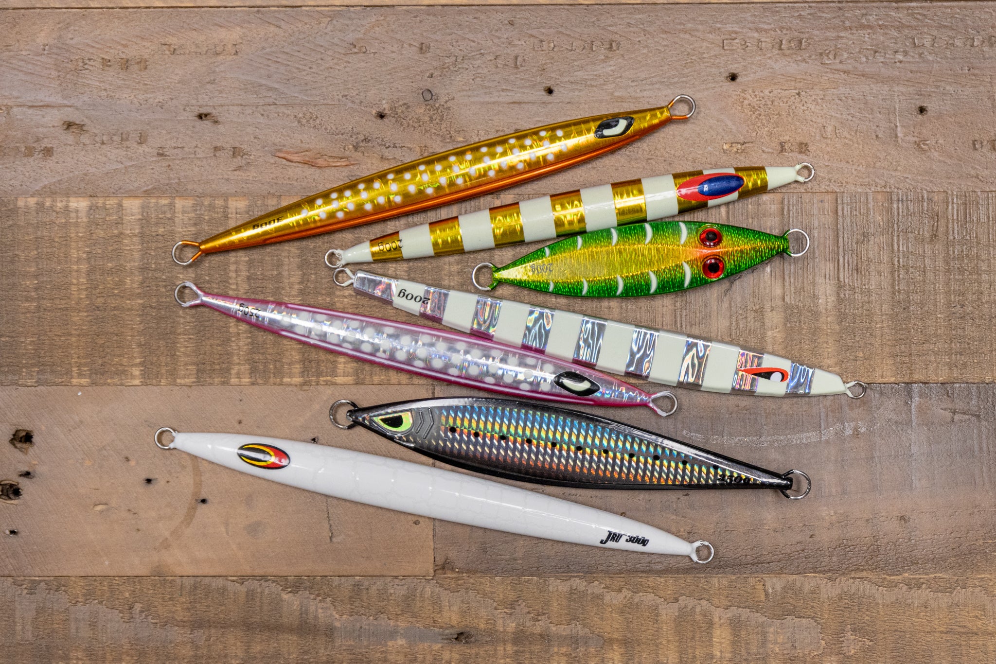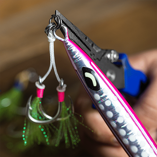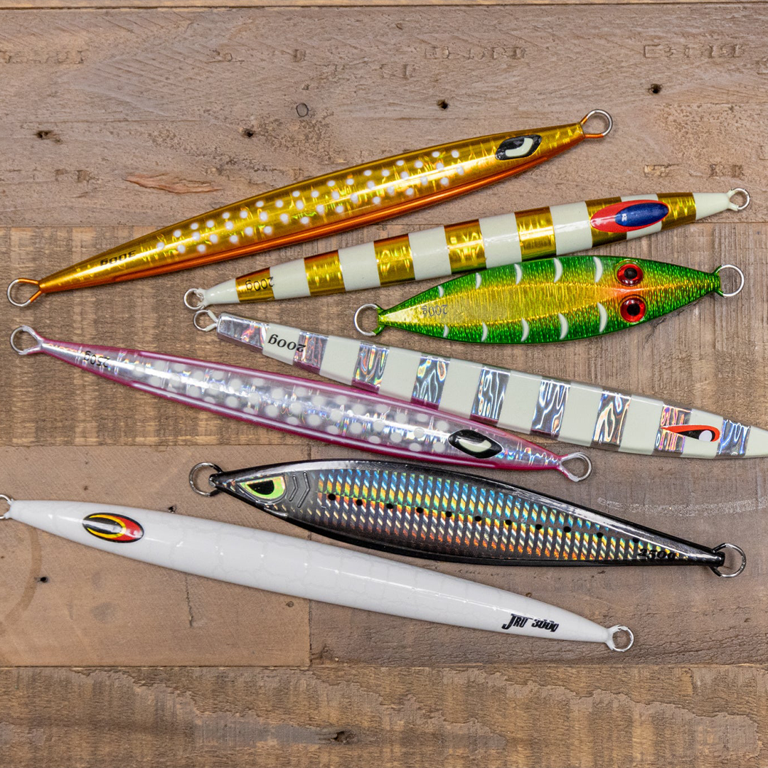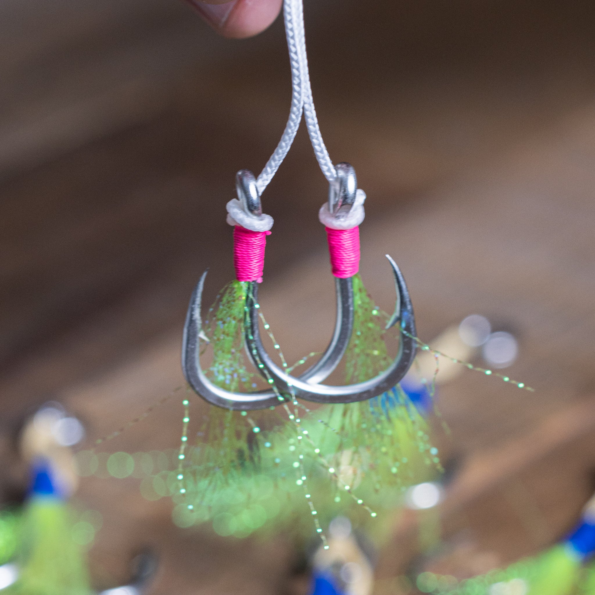 All of our slow pitch jigs are ready to fish right out of the package. All jigs are rigged with stainless steel split rings, stainless steel solid rings and top and bottom dual assist hooks.